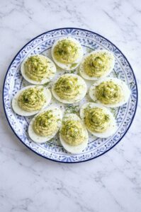 These bright and herbaceous deviled eggs are perfect for spring with their fresh dill and zesty lemon flavors. The lemon juice cuts through the richness of the egg yolks while the dill adds a fresh, garden-like taste that screams Easter brunch.