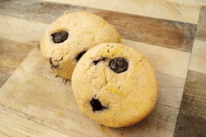 • Scoop dough into 12 tall balls (5 oz each), press extra chocolate on tops.