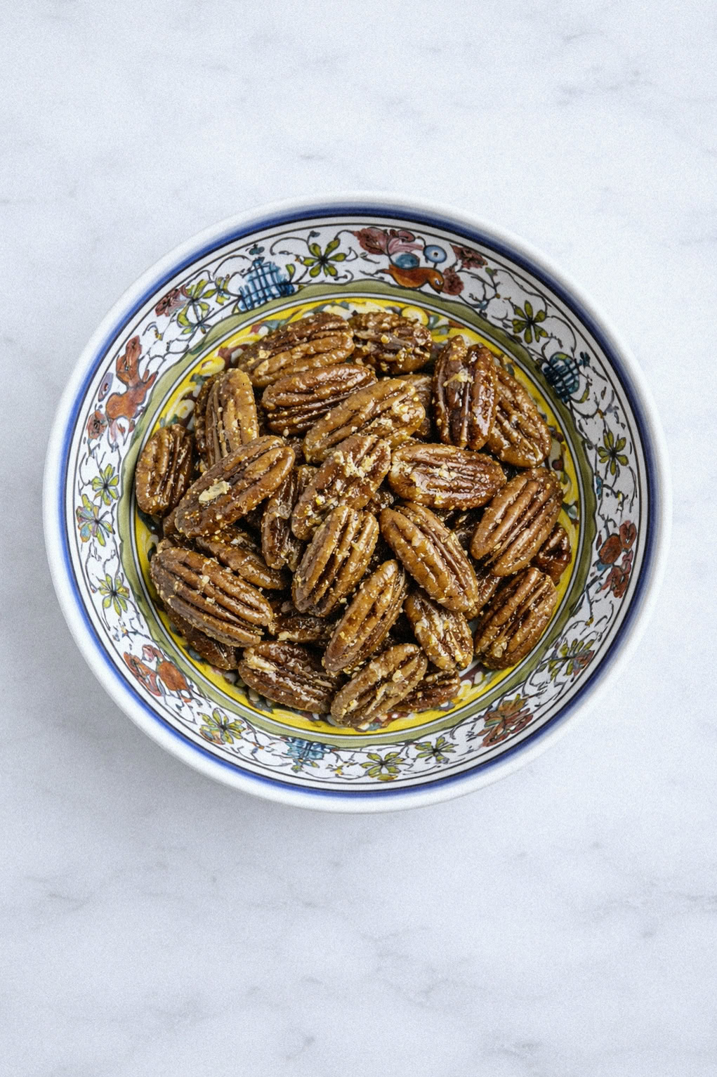 You want to see the orange-red seasoning mixture clinging to each pecan half.