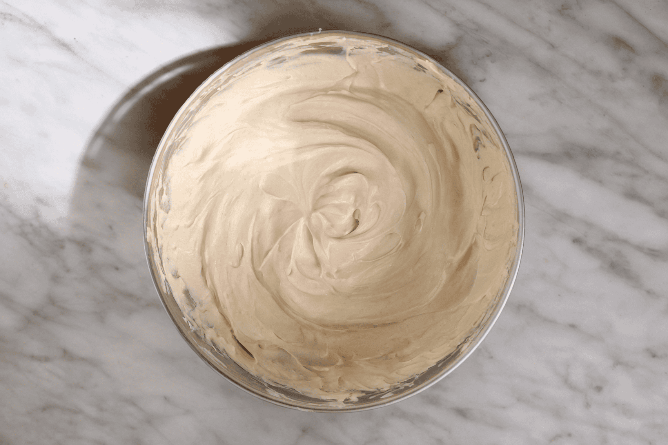 - Add cooled maple base one spoonful at a time, mixing fully between additions.